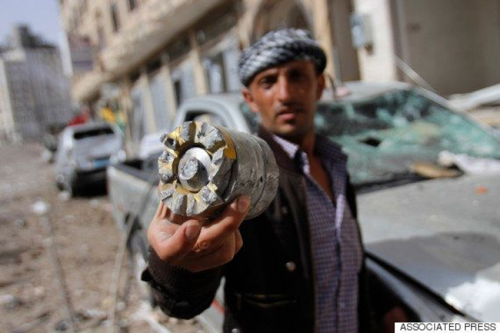 Un hombre muestra los restos de un proyectil después de un ataque aéreo liderado por los saudíes contra los chiíes rebeldes aliados con Irán. Saná (Yemen), abril de 2015. (AP Photo/Hani Mohammed, File)