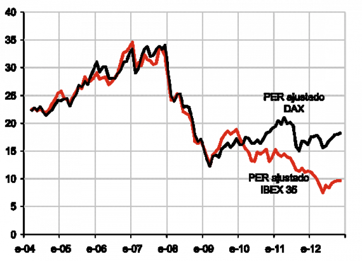 La diferencia del PER entre países puede ser muy significativa, como sucede con los cálculos para los mercados de acciones de España y Alemania. Hoy, los inversores están dispuestos a pagar 10 veces por un ciclo de beneficios del IBEX, muy lejos de las 35 veces que llegaron a pagar en 2006-2007 y cerca de mínimos de los últimos ocho años. En el mercado bursátil alemán (DAX) los inversores están dispuestos a pagar 18 veces por un ciclo de beneficios del conjunto de las empresas cotizadas alemanas.