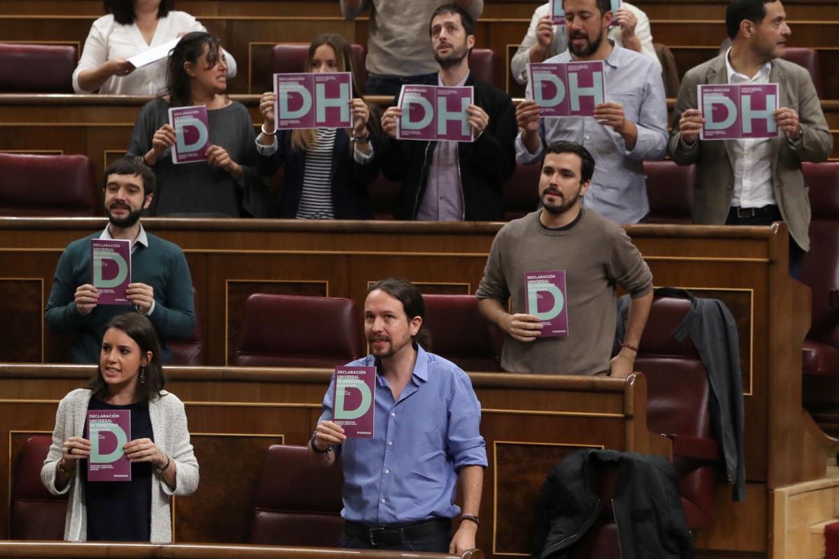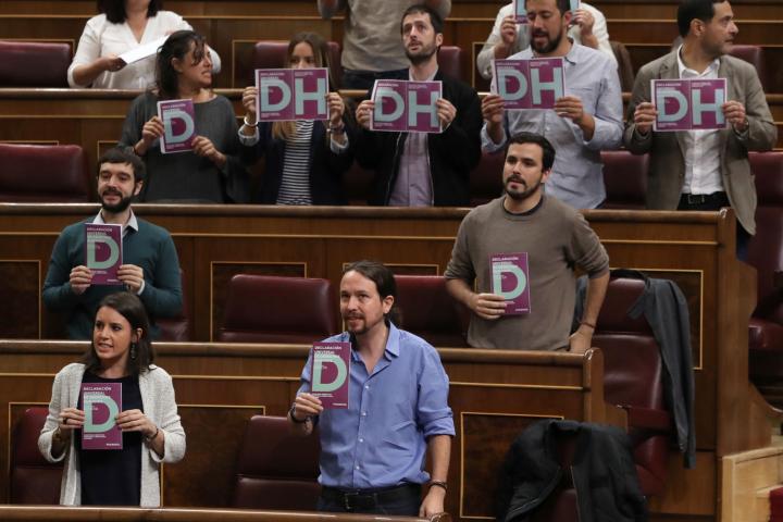 Diputados de Unidos Podemos realizan una protesta en el Congreso de los Diputados. (EFE)