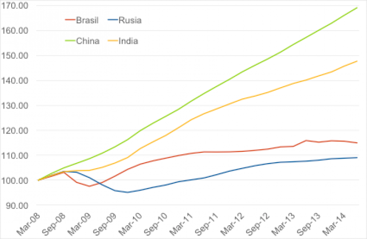 En el gráfico adjunto, en el que se compara la evolución del PIB desde el 1T08, se observa que tanto Brasil como Rusia no han cumplido las expectativas, y ello a pesar del contexto favorable en el precio de las materias primas.