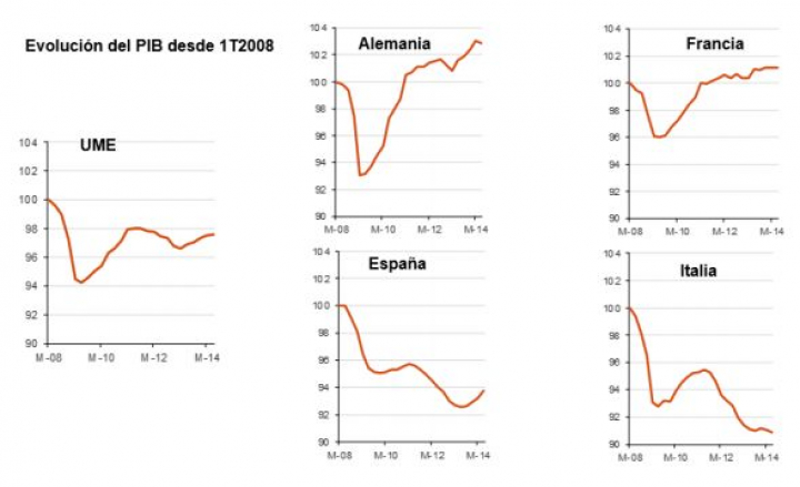 Gráfico 1. Evolución del PIB de la UME, Alemania, Francia, España e Italia.