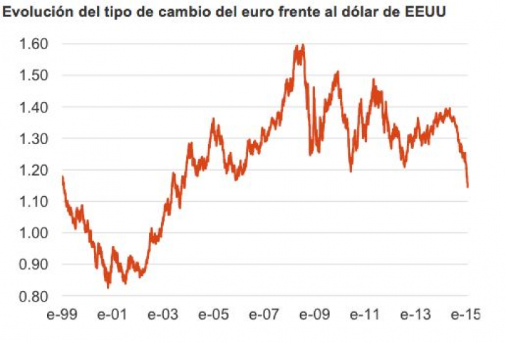 Pero se consiguen otros efectos positivos. Y vuelvo a recurrir a una de las frases que escribía en septiembre: "Si un Quantiative Easing del BCE sirve, además de para reducir los tipos de interés, para debilitar nuestra moneda (claramente sobrevalorada) será una buena medida, tanto para el crecimiento como para evitar el riesgo de deflación". La afirmación sigue siendo válida, aunque con un matiz. En niveles de 1,15 USD/EUR ya no se puede decir que el euro esté sobrevalorado (entonces cotizaba a 1,30). Entramos ahora en un período en el que nuestra moneda debe cotizar infravalorada. Recupero el gráfico de la evolución de tipo de cambio del EUR contra el USD para comprobar los niveles de cotización vigentes entre 2000 y 2003: este es uno de los objetivos a alcanzar. Y para ello es útil la decisión del BCE. Evidentemente la UME no saldrá del estancamiento sólo con las medidas de política monetaria no convencional. Hacen falta reformas estructurales, y allí donde se pueda, aplicar programas de estímulo. Pero nuestro banco central ha hecho su parte del trabajo. Con retraso, sí, pero se ha impuesto a la opción más reacia. De nuevo, valiente e inteligente Draghi.