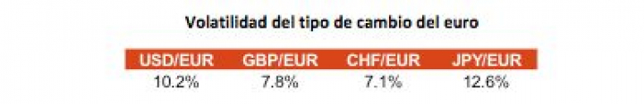 A lo que nos dedicamos los analistas, gestores y asesores financieros es a tratar de anticipar la dirección del movimiento y a determinar el porcentaje de la inversión que se debe exponer a las distintas variables a partir de parámetros como la volatilidad. Si creemos que el dólar va a continuar su apreciación frente al euro, invertimos en la moneda de EEUU, siendo conscientes de que el movimiento potencial en un año es de ese 16 por ciento, lo que tenemos en cuenta por si nos equivocamos. ¿Es el euro igual de volátil frente a todas las monedas? En la siguiente tabla recojo la volatilidad del tipo de cambio de nuestra divisa frente al dólar (USD), a la libra esterlina (GBP), al yen japonés (JPY) y al franco suizo (CHF). Se observa que oscila entre el 7,1 por ciento y el 12,6 por ciento. Es decir, el euro es más volátil frente a la divisa de Japón que frente a la de Suiza. Pero, en cualquier caso, su tipo de cambio se mueve, y mucho.