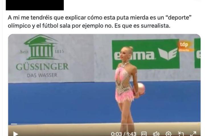 "A mí me tendréis que explicar cómo esta puta mierda es un 'deporte' olímpico y el fútbol sala por ejemplo no. Es que es surrealista", ha criticado el tuitero junto al vídeo la actuación de la deportista rusa. Su publicación ha generado mucha indignación por la falta de respeto a un deporte tan exigente, tanto a nivel físico como mental, como el de la gimnasia rítmica.