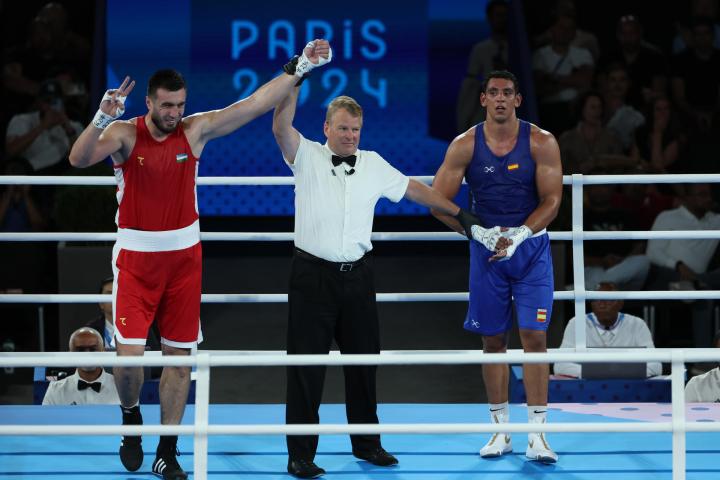 No pudo ser. El boxeador español Ayoub Ghadfa se ha tenido que conformar con la medalla de plata en la final de boxeo en la categoría de +92 kg de los Juegos Olímpicos de París de 2024 tras perder ante el uzbeko Bahodir Jalolov en la lucha por el oro en la pista central de Roland Garros.