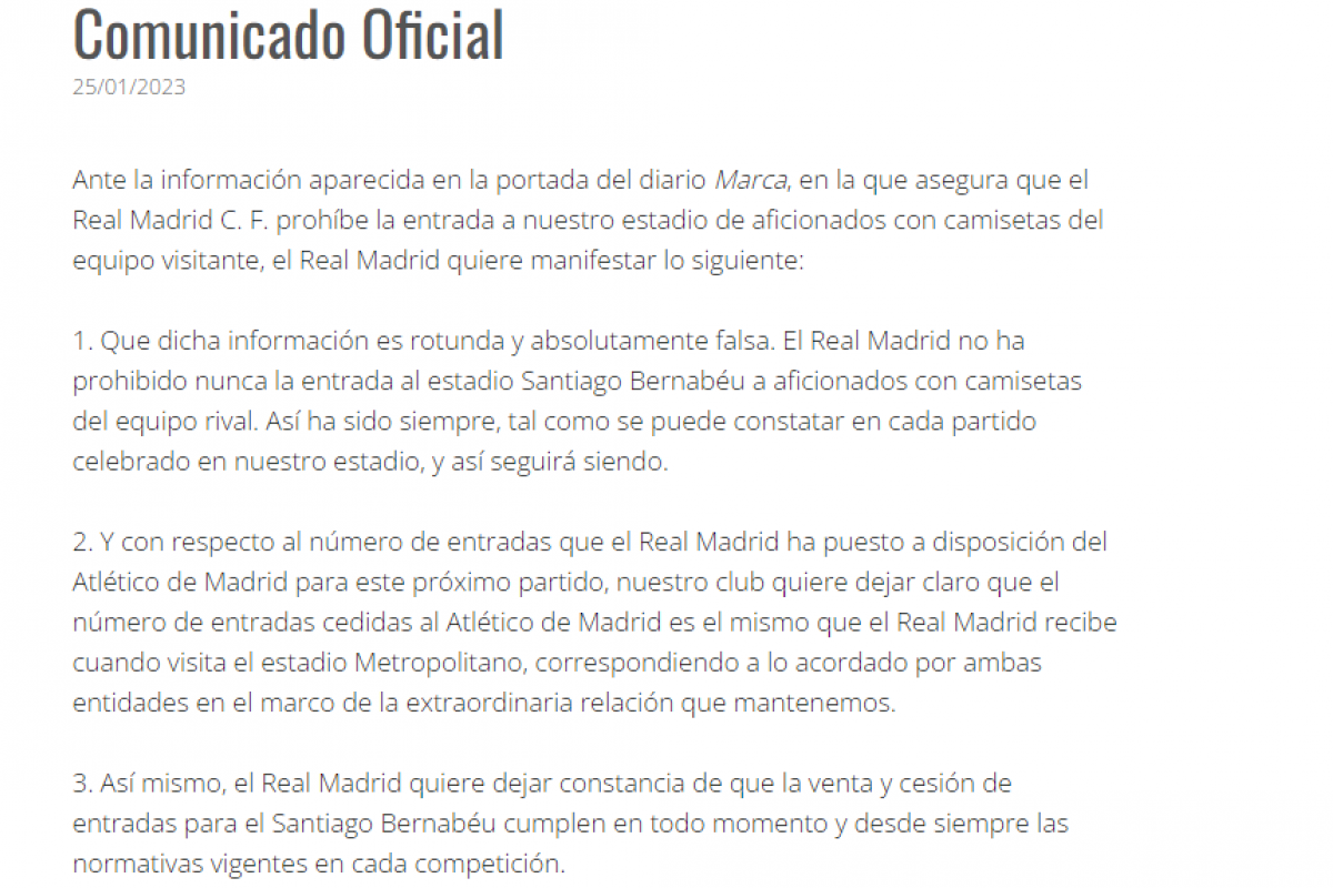 Por este motivo, el club presidido por Florentino Pérez no se ha mantenido al margen y alrededor de las 11 de la mañana, ha emitido un comunicado oficial en el que desmiente lo publicado en el medio deportivo, asegurando que "el Real Madrid no ha prohibido nunca la entrada al estadio Santiago Bernabéu a aficionados con camisetas del equipo rival. Así ha sido siempre [...] y así seguirá siendo".