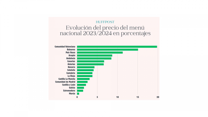 El mayor incremento en el precio del menú lo ha sufrido la Comunidad Valenciana, con una subida del 32% en ocho años y un menú diurno de 15,10 euros. En la lista también aparecen Asturias y País Vasco, con un incremento del 28% y del 26% respectivamente. En cuanto a las que menos suben, se encuentran Murcia, Castilla-La Mancha y Canarias.