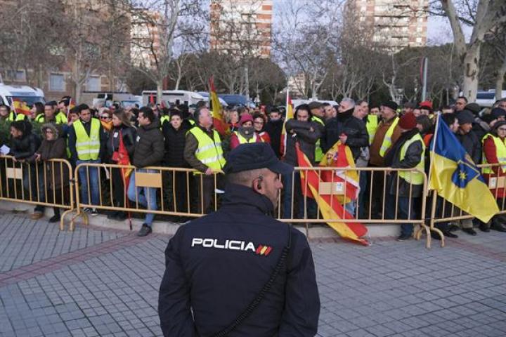 Alrededor de 600 agricultores y ganaderos, según la Delegación del Gobierno en Castilla y León, se han concentrado esta tarde a las puertas de la Feria de Valladolid, donde se celebra la 38 edición de los Premios Goya, para hacer llegar sus reivindicaciones con pitidos, cencerros y algún petardo, pero sin incidentes reseñables.