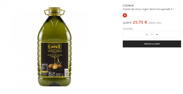Se trata de un aceite de oliva virgen 'Serie Oro', cuya garrafa de 3 litros se encuentra a un precio asciende a 25,75 euros, por lo que el litro se ubica en 8,58€, lo que implica una rebaja de un 17%, ya que antes se vendía a 30,99€.