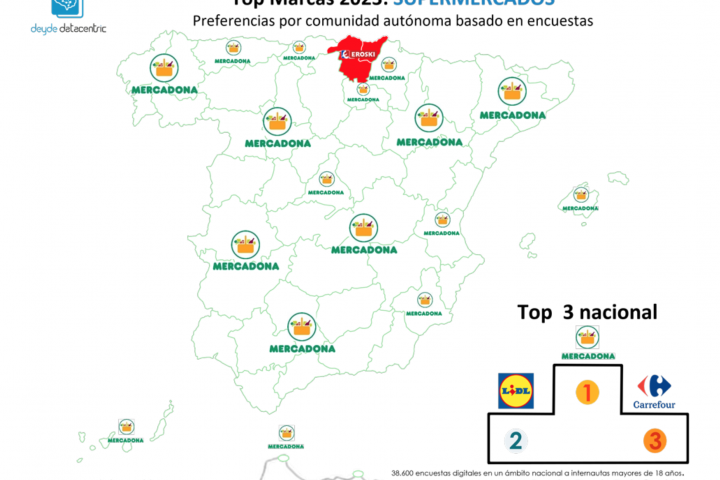 En cuando a la valoración de las marcas, los especialistas señalan que, "como ocurre con ZARA en textil", en supermercados "el logo de Mercadona reina en casi todos los territorios de España". La enseña vasca Eroski se mantiene firme en su lugar de origen pese a la expansión de la valenciana. Mercadona se ha hecho con una legión de apóstoles, a pesar de no ser líder en cobertura en la mayor parte de comunidades (como se puede ver más abajo). Justo lo que refleja el top 3 nacional con Mercadona (35,54% de los votos) superando a sus perseguidores, Lidl (19,53%) y Carrefour (14,07%) por un amplio margen.