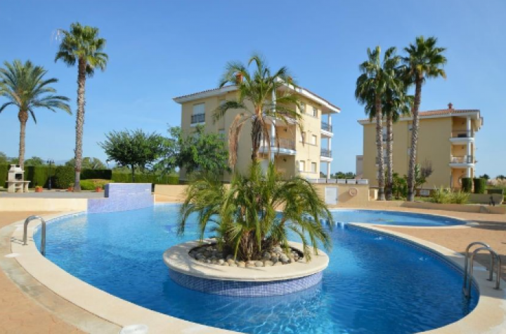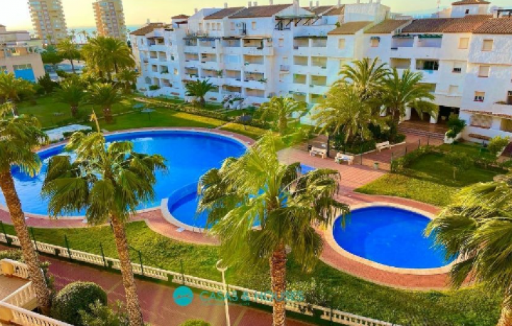 Esta vivienda cuenta con tres piscinas unidas y rodeadas de jardines y pista de tenis. En lo que respecta a la vivienda en sí, se trata de una casa con recibidor, cocina equipada, salón comedor, terraza y cuarto de baño completo, repartidos entre sus 62 metros cuadrados, en los que también hay suelo radiante.