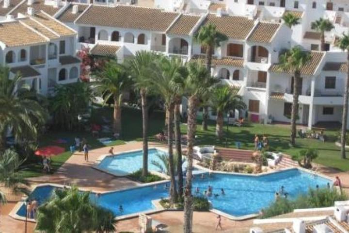 Cuenta con dos habitaciones, un baño y una terraza, además de aire acondicionado. En cuanto a las zonas comunitarias, cuenta con dos piscinas y jardines y pista de tenis. Y por último informan de que se encuentra muy cerca de restaurantes, heladerías, comercios, farmacias, paradas de transportes, etc. Y se ubica a tan solo 30 metros del mar mayor y a 60 del mar menor.