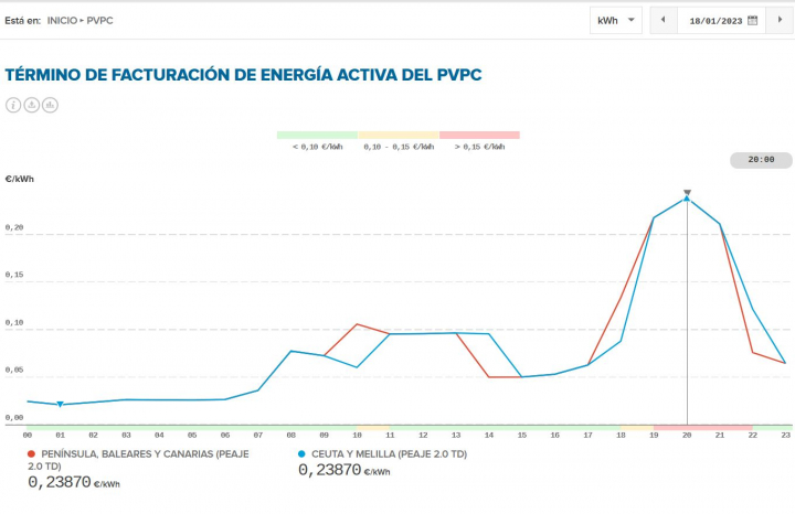 Por el contrario, las 20:00 horas será el momento de este miércoles 18 de enero en el que la electricidad alcanzará su mayor coste, con un precio de 0,23870 euros por kilovatio hora en la Península, Baleares, Canarias, Ceuta y Melilla.
