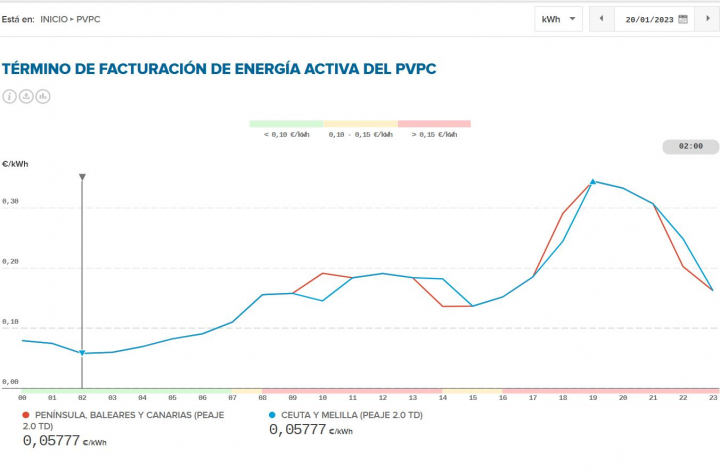 Por el contrario, las 19:00 horas será el momento de este viernes 20 de enero en el que la electricidad alcanzará su mayor coste, con un precio de 0,34468 euros por kilovatio hora en la Península, Baleares, Canarias, Ceuta y Melilla.