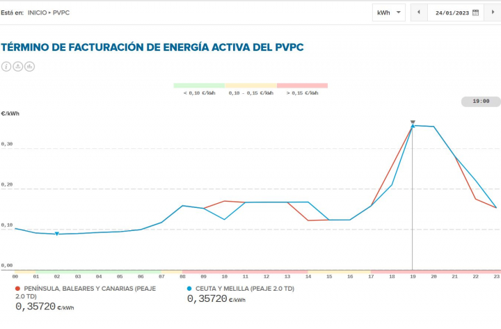 Por el contrario, las 19:00 horas será el momento de este martes 24 de enero en el que la electricidad alcanzará su mayor coste, con un precio de 0,35720 euros por kilovatio hora en la Península, Baleares, Canarias, Ceuta y Melilla.