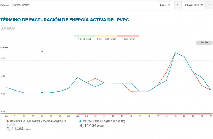 Según los datos publicados por Red Eléctrica de España, el tramo horario con la luz más barata este miércoles 25 de enero se registrará a las 04:00 horas, cuando el precio del kilovatio hora se situará en 0,11464 euros en la Península, Baleares, Canarias, Ceuta y Melilla.