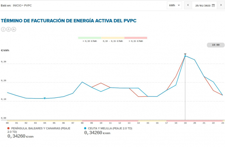 Por el contrario, las 19:00 horas será el momento de este miércoles 25 de enero en el que la electricidad alcanzará su mayor coste, con un precio de 0,34260 euros por kilovatio hora en la Península, Baleares, Canarias, Ceuta y Melilla.