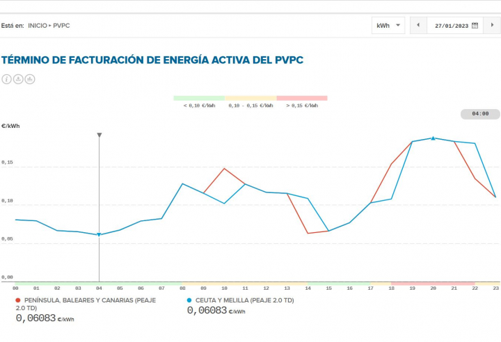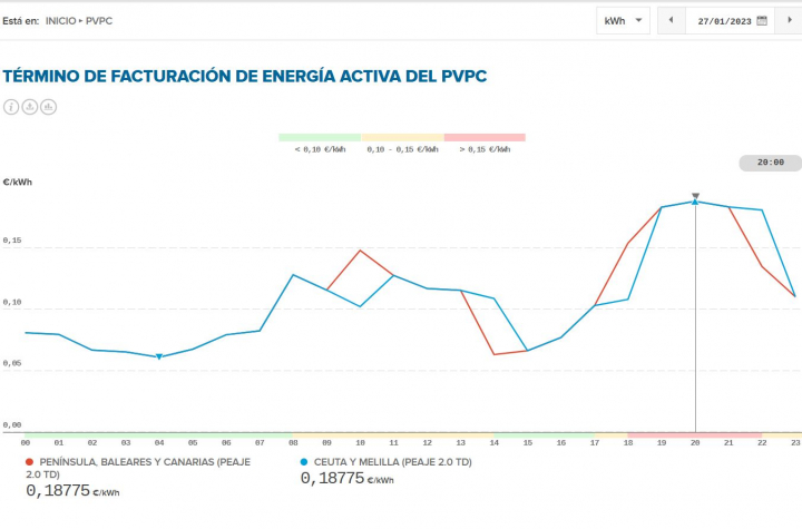 Por el contrario, las 20:00 horas será el momento de este viernes 27 de enero en el que la electricidad alcanzará su mayor coste, con un precio de 0,18775 euros por kilovatio hora en la Península, Baleares, Canarias, Ceuta y Melilla.