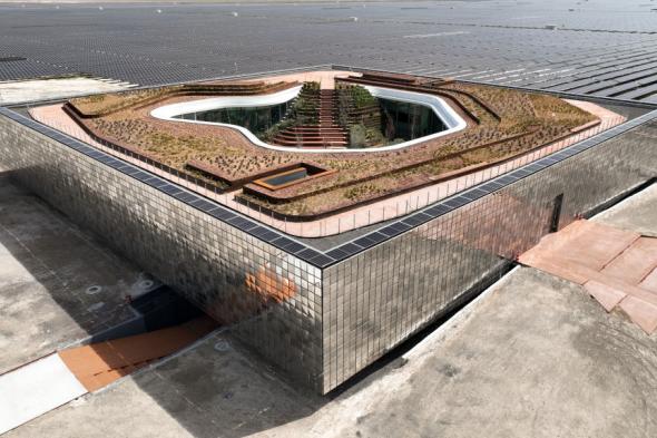 La central fotovoltaica no solo impresiona por su capacidad energética, también destaca por su diseño. En el centro del complejo, diseñado por Bilgin Architects, se ha construido un edificio que va más allá de ser un simple espacio de trabajo. Su forma cúbica con un patio central y la fachada revestida de placas de acero inoxidable, que crean una sinergia perfecta con el entorno, guardan el cerebro que gestiona el parque de paneles solares.
