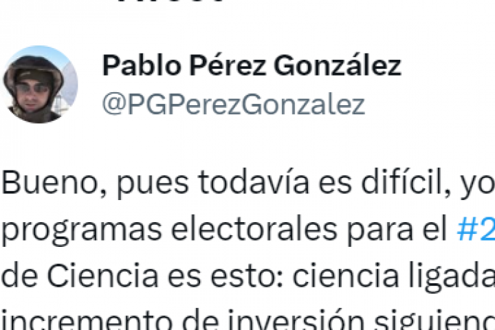 Por último, Pérez González ha publicado un último tuit a modo resumen en el que extrae una conclusión de lo que plantean las cuatro principales formaciones en una materia que no suele ocupar el foco mediático como es la ciencia.