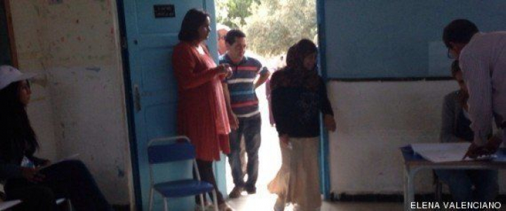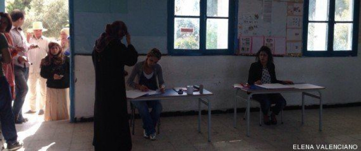 Túnez, cuatro mujeres, dos de ellas muy jóvenes: la que identifica a los votantes y la que les entrega la papeleta de voto con las listas de los partidos.