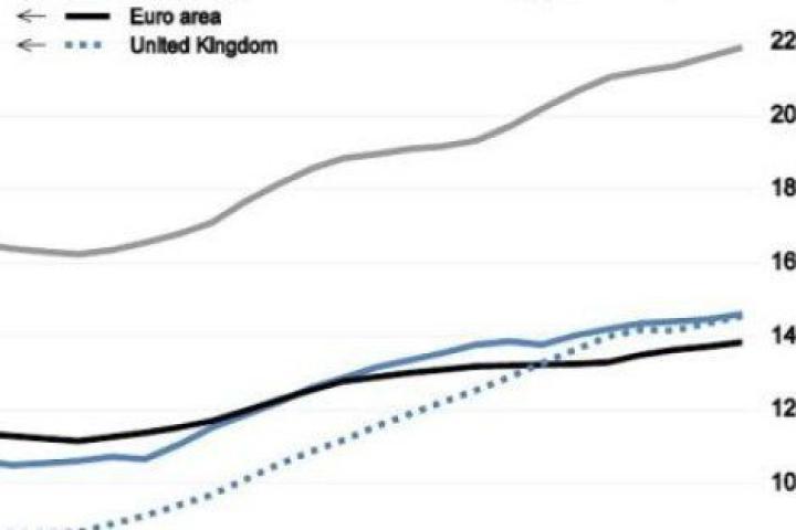 Acelerar la transición a la unión bancaria es una condición necesaria para que esa renovada desconfianza desaparezca, pero no es suficiente. La eurozona necesita crecer, y para ello, como admite la OCDE, han de flexibilizarse las imposiciones de consolidación fiscal, que además de ser guiadas por objetivos de reducción del déficit estructural (en lugar de hacerlo en términos nominales), han de conceder más tiempo a esos objetivos. Como se aprecia en el gráfico adjunto, las posiciones de deuda publica de la eurozona siguen siendo significativamente mas bajas que las del resto de las economías importantes, donde el saneamiento de las finanzas públicas es mucho menos riguroso que en el área monetaria europea. También al igual que hacen los otros bancos centrales, el BCE ha de asumir una política monetaria más estimuladora, dada la ausencia de amenazas inflacionistas y las amenazas todavía vivas de fragmentación financiera.
