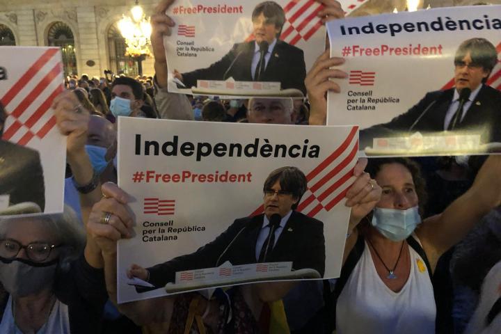 Solo faltaban ocho días para que el independentismo celebrara el cuarto aniversario del referéndum del 1 de octubre y Puigdemont fue detenido en Cerdeña. El presidente de la Generalitat, Pere Aragonés, voló hacia allí rápidamente para escenificar que está a su lado frente a un Tribunal Supremo que decidió mantener activa la Euroorden cuando ya muchos la daban por anulada. Un día después, la Plaça Sant Jaume estaba llena (5.000 personas, aún lejos de los mejores días del independentismo) y Jordi Cuixart, presidente de Òmnium y uno de los presos indultados por el gobierno, gritaba a pleno pulmón y espoleado por las masas: “¡Lo volveremos a hacer!”.