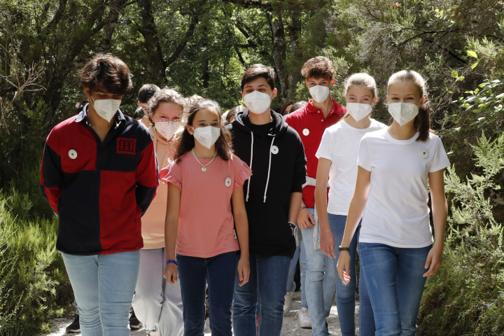 6. En la fotografía enmarcada a la derecha del rey, a la izquierda de la imagen, vemos a la princesa Leonor y a la infanta Sofía en su primer acto sin los reyes, cuando acudieron a la Reserva de la Biosfera de Montejo de la Sierra, en Madrid. En la imagen se les ve paseando con un grupo de jóvenes europeos.