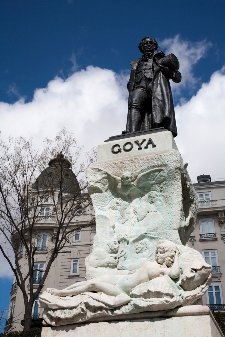 En los exteriores del Museo del Prado se sitúan las estatuas de Murillo, Goya y Velázquez: en el sur, el norte y el oeste, respectivamente. Mientras que las de Murillo y Velázquez dan la espalda a la fachada de la pinacoteca, la de Goya es la única que la mira de frente.