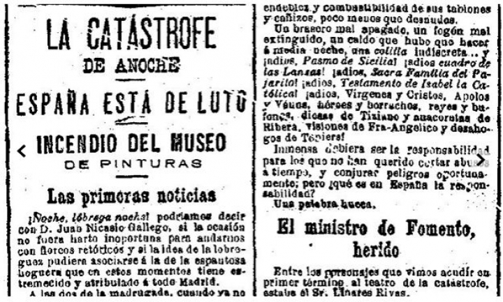 Sufrió un falso incendio en 1891 en el que habría perdido todas las grandes obras que albergaba. Se vendió como una catástrofe en El Liberal con titulares como “España está de luto”. Se trataba de un invento del periodista Mariano de Cavia.
