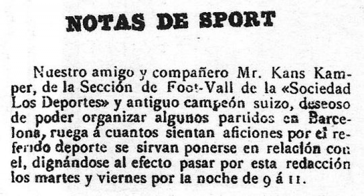 “Nuestro amigo Kans Kamper [...] deseoso de poder organizar algunos partidos en Barcelona ruega a cuantos sientan aficiones por el foot-vall se sirvan ponerse en relación con él”. Nadie lo podía imaginar entonces, pero aquellas palabras publicadas el 22 de octubre de 1899 en el periódico local Los Deportes cambiaron la historia del fútbol.