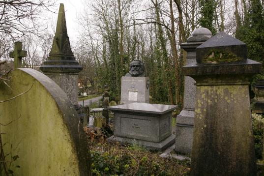 - Marx falleció en 1883, a los 64 años. Apenas 11 personas acudieron a su entierro, en el que se leyó un telegrama del movimiento obrero español. "Proletarios de todos los países, uníos", se lee en su lápida. Su tumba se encuentra en el cementerio de Highgate, en Londres, donde apenas un adorno la embellecía hasta que en 1954 se colocó una estatua en su honor. Marx murió como un apátrida, enfermo de una gripe que le atacó justo tras la muerte de su esposa, que lo tuvo convaleciente 15 meses. Una bronquitis y una pleuritis acabaron con su vida cuando dormía en su sillón.