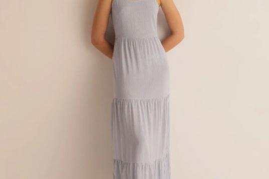 Con una alpargata de plataforma o una sandalia de tiras plana, este vestido largo de estilo campesino es un básico del verano. Disponible en Hipercor.