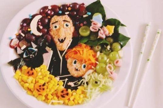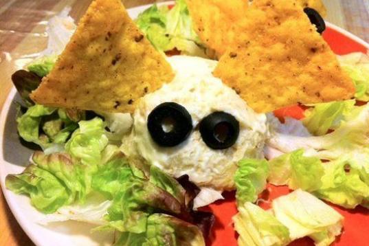Una divertida ensalada, con uvas, col, jamón, queso, zanahoria y arroz, ideal para servir a los niños el día de Halloween.