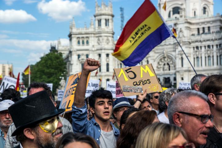 Y de la mano de la movilización social y de experiencias múltiples y reales de auto-organización popular, asistimos a una progresiva impugnación del relato oficial de la cultura de la Transición y, sobre todo, de sus instituciones centrales. Porque, entre otras muchas cosas, el 15-M supuso una impugnación radical del régimen del 78 al grito de “democracia real ya”. Cuestionando los límites de la democracia formal, pidiendo más democracia, intentando resolver la escisión entre lo realmente existente y lo que debería ser, un grito que conectaba, 140 años después, con la experiencia de la Comuna de París como acontecimiento mayor de recreación democrática.