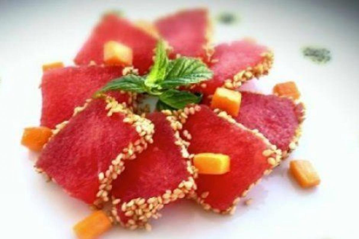 Si existe una forma original de preparar una receta con sandía, es la de este cocinero que la ha disfrazado de atún. Acompañada de una salsa de frambuesa y un poco de aceite de sésamo consigue como resultado un curios...