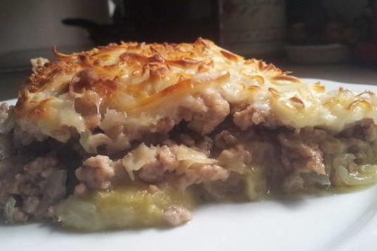 La berenjena es la base de este plato, que se hace en cinco pasos y que también lleva carne picada, cebolla y queso. Si la haces grande, tendrás para varias raciones.