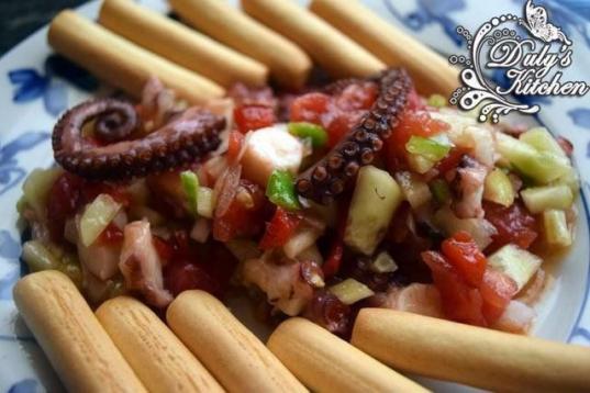 Si el pulpo lo compras ya cocido podrás tenerlo listo en muy pocos minutos. Sólo tendrás que trocear el resto de ingredientes y preparar este aliño.