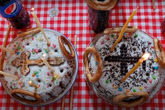 En algunos monasterios, se ayuna el día antes para disfrutar luego del festín, un tiempo en el que se celebran oficio y se cantan salmos. Cuando se hacen las visitas a las tumbas, es común colocar en ellas un huevo de Pascua, símbolo de la salida de Cristo de la tumba.