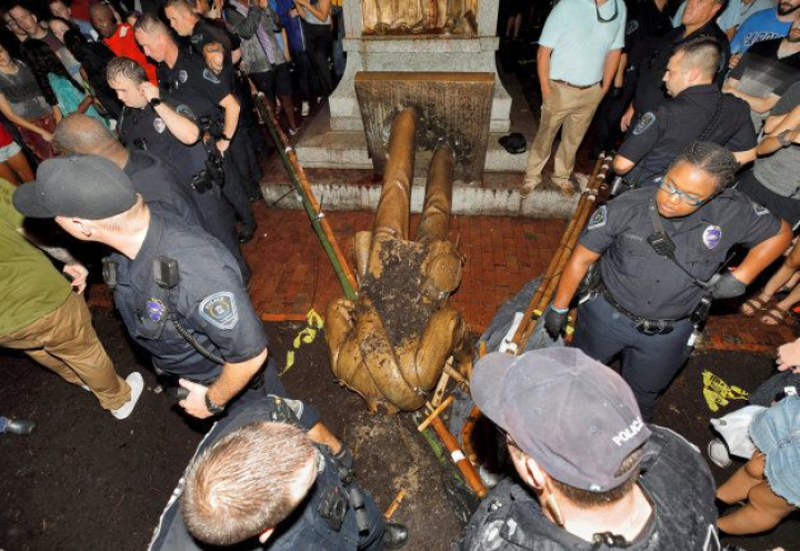 Alrededor de 300 manifestantes se han reunido frente Silent Sam, un monumento a los soldados confederados asesinados durante la Guerra Civil. Tras dos horas de protestas, la estatua que lleva en el campus de Chapel Hill desde 1913, ha sido derribada, según han informado medios locales.