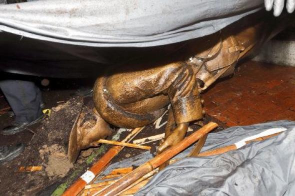 Los manifestantes han tirado la estatua con una cuerda y han echado tierra sobre ella, según los medios. La estatua estaba boca abajo en el barro con tierra en la parte posterior de la cabeza y espalda.