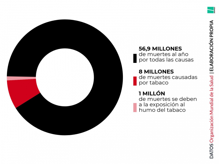 28. Hasta 3,3 de los 8 millones de fallecidos anualmente en relación con el tabaquismo mueren por afecciones ligadas al sistema pulmonar.