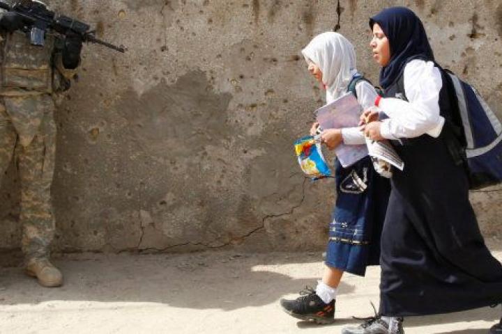 33Dos niñas pasan delante de un soldado estadounidense que patrulla junto a la policía de Irak en Bagdad. 14 de octubre de 2008.