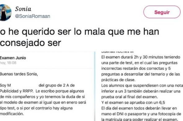 La intención de la joven alumna era la de preguntar a su profesora, Sonia. Y a Sonia se lo envió, sin duda, pero un error hizo que en vez de a su profesora le llegará a una alumna que se llama así y no tiene nada que ver. La respuesta de la receptora del correo ya es historia de Twitter.