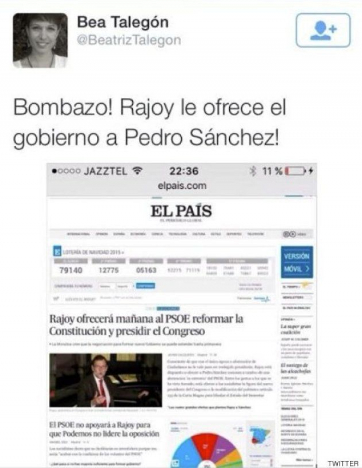 Pero Talegón entendió esto: "¡Bombazo! ¡Rajoy le ofrece el Gobierno a Pedro Sánchez!".
