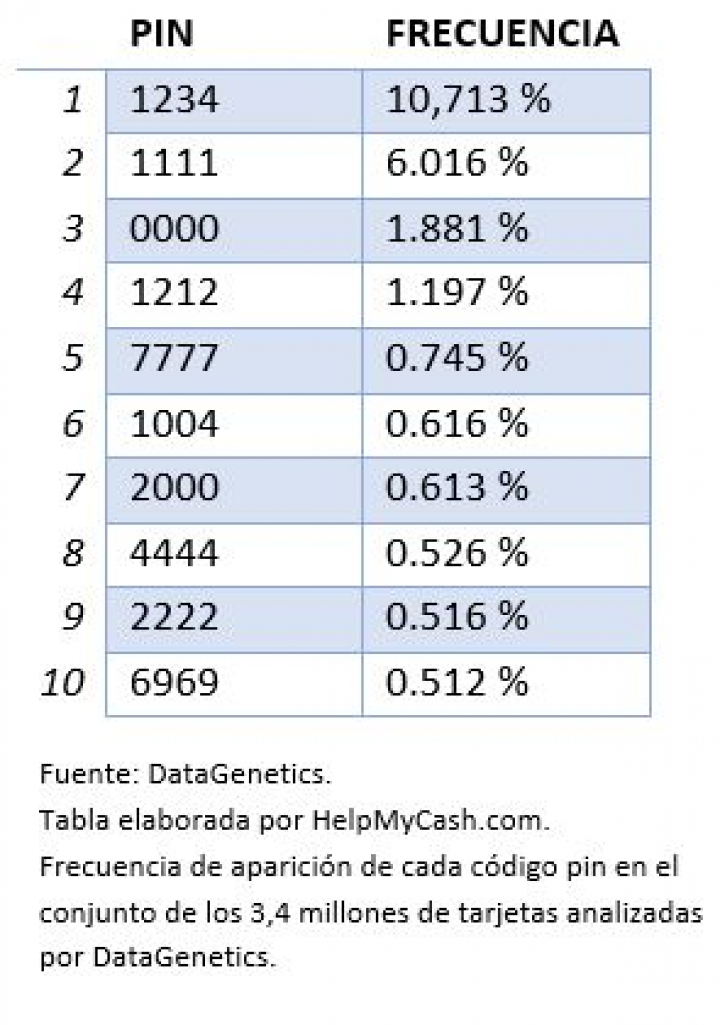 Pero no toda la responsabilidad recae en los bancos. Nosotros, como usuarios, también debemos ser diligentes. Y parece que no siempre lo somos, sobre todo con las contraseñas que escogemos. El caso de las tarjetas de crédito es paradigmático: tenemos 10.000 posibilidades entre las que elegir para seleccionar un código pin y muchos acabamos optando por los mismos cuatro dígitos. Según un estudio hecho público por DataGenetics, que analizó hace unos años 3,4 millones de tarjetas, el 19 % de los plásticos podían ser hackeados probando únicamente tres combinaciones: 1234, que era el código más popular compartido por el 11 % de las tarjetas, 1111 y 0000.