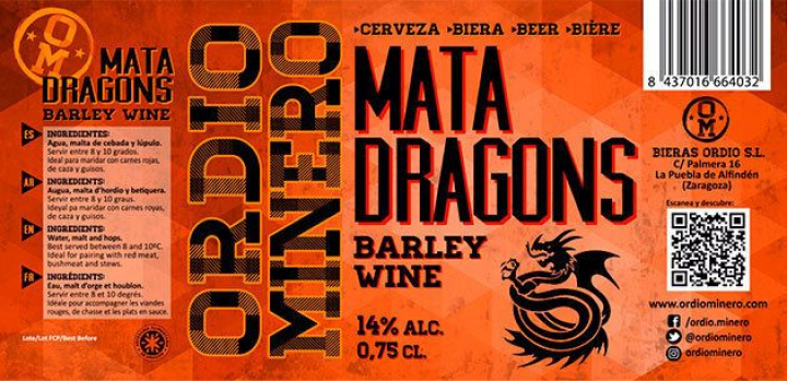 Matadragons de Ordio Minero (Zaragoza): el 14% de alcohol la convierte en un peligro. Vemos una barley wine color caoba coronada por espuma efímera. En el aroma percibimos notas a bollería tostada, pasas y licor. En boca recuerda a dátil, caramelo y cereal. El dulzor no es empalagoso. El regusto nos evoca miel y ahumado. Se descubre como una cerveza muy equilibrada.
