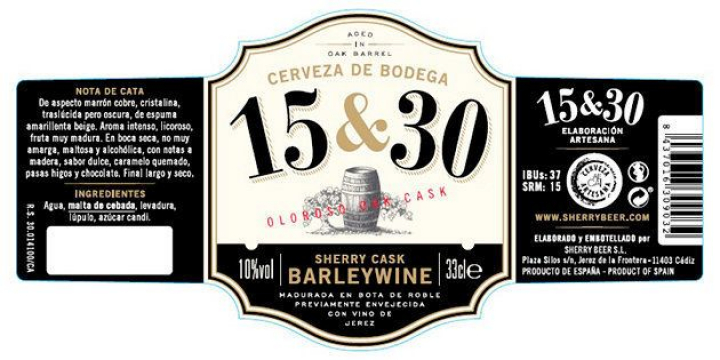 Barley Wine de Sherry Beer 15&30 (Cádiz): desde tierra de olorosos nos llega esta cerveza madurada durante seis meses en barricas de Jerez y otros seis meses en botella antes de salir a la venta. De aspecto cobre oscuro, resulta compleja y licorosa con notas a brandy y a cacao. Es intensa y maltosa. Lacrada la botella y con 10% de alcohol, podemos guardarla para compararla con la añada anterior.
