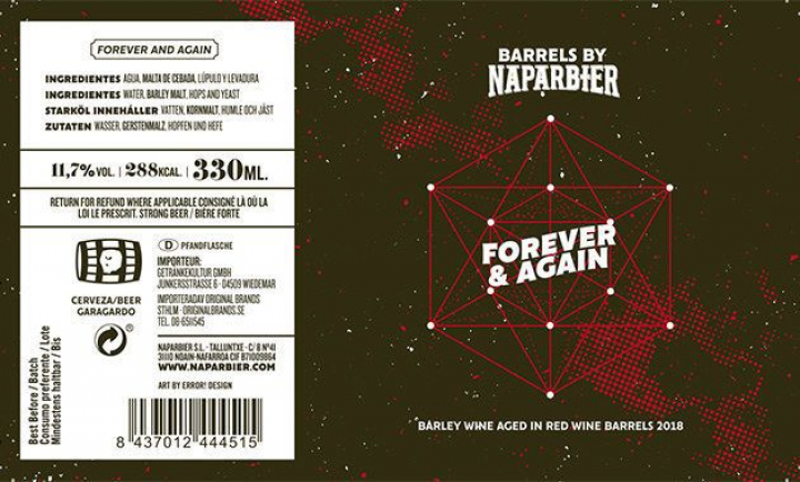 Forever & Again de Naparbier (Navarra): esta barley wine es fruto de envejecer la cerveza en barricas de vino tinto DO Navarra y a continuación mezclar la que ha madurado durante un año con la que lleva dos años en barrica. El resultado es una barley wine de perfil vinoso con recuerdos a madera y 11,7% de alcohol.