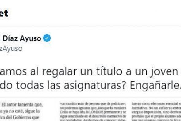 ″¿Qué logramos al regalar un título a un joven que no ha superado todas las asignaturas? Engañarle”, dice Ossorio. Una frase que utiliza la propia Ayuso en su tuit.